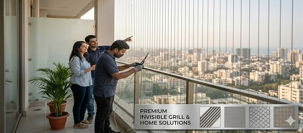 Strong and modern Invisible Grill solutions for balcony safety and child protection systems.